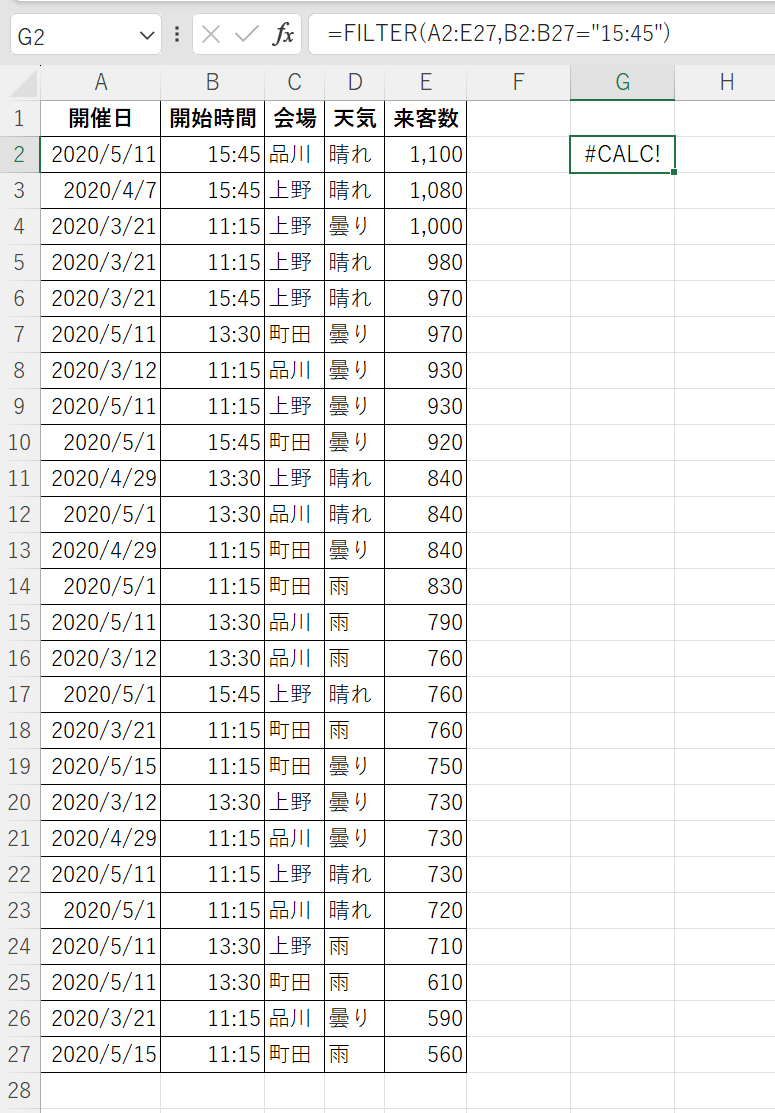 また、以下は失敗例です。FILTER関数ではTIMEVALUE関数で囲まない時刻型文字列は認識されません。
