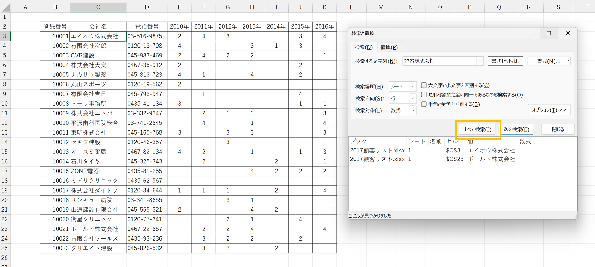 - 散らばる「????株式会社」という文字列(株式会社の前が4文字)を一括で「すべて検索」し、一覧で表示する。
