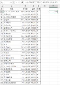 例えば、ある書籍リストから「刑法」を含む書籍の中で一番上のアイテムの価格を検索したい場合は、以下のように式を設定します。