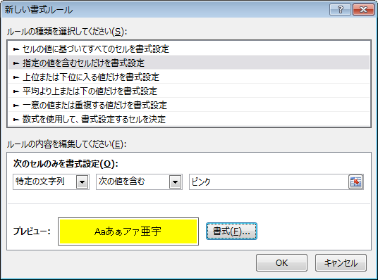 あとは「○○を含む」などを指定し、[書式]ボタンで色などの設定を指定します。