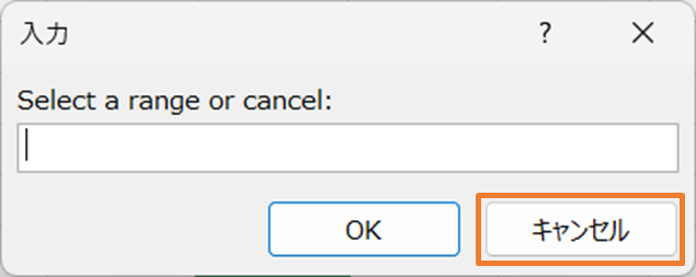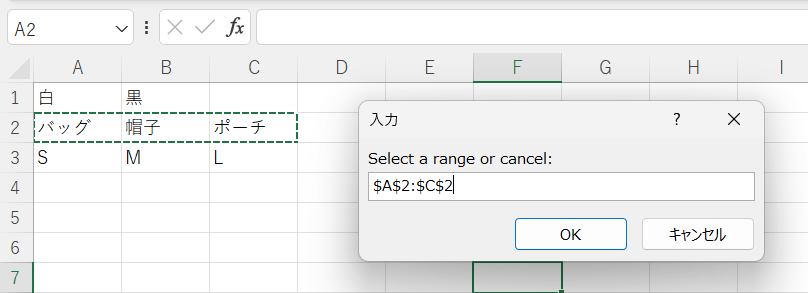 - 表示されたインプットボックスで、配列が入力されているセル範囲を指定し、「OK」をクリックします。