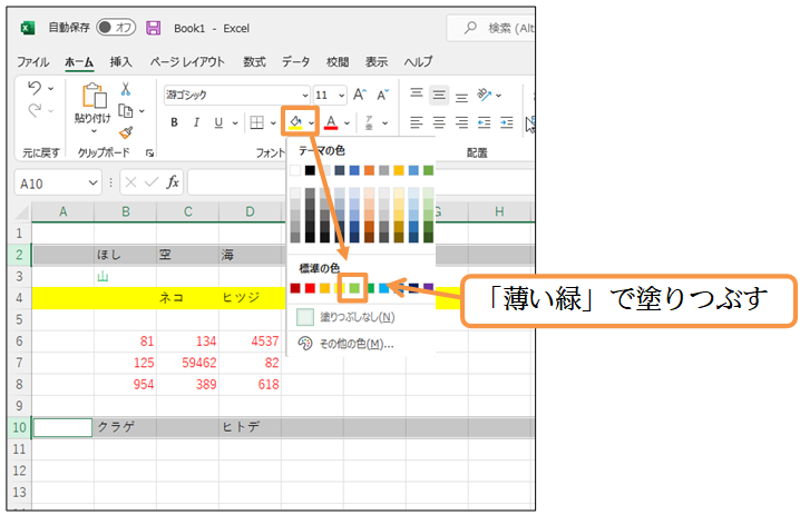 (03) 続けて2行目と10行目を同時に「薄い緑」で塗りつぶします。2行目を選択してから、{Ctrl}キーを押しながら10行目を選択することで追加選択になります。