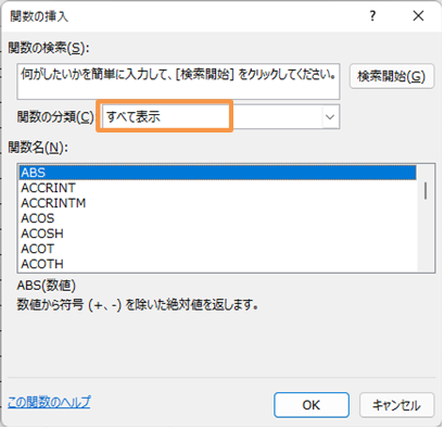 ここでは[関数の分類]を「最近使った関数」から「すべて表示」にしてください。