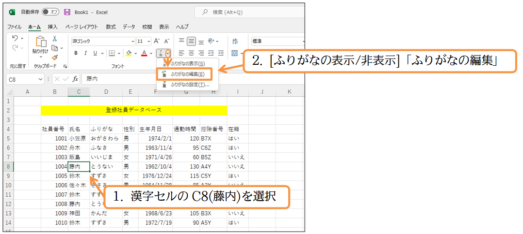 (04) さて「1004」番の「藤内」さんは「ふじうち」さんでした。よって読みを修正します。修正するには[漢字セル]を選択して[ふりがなの表示/非表示]「ふりがなの編集」を使います。