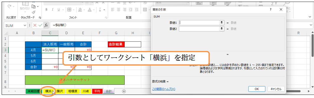 (03) 続けて引数(集計の対象)を指定します。最初にワークシート「横浜」を指定します。