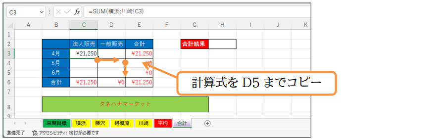 (06) 「合計」シートのセルC3に戻りました。この計算式はD5までコピーしてください。